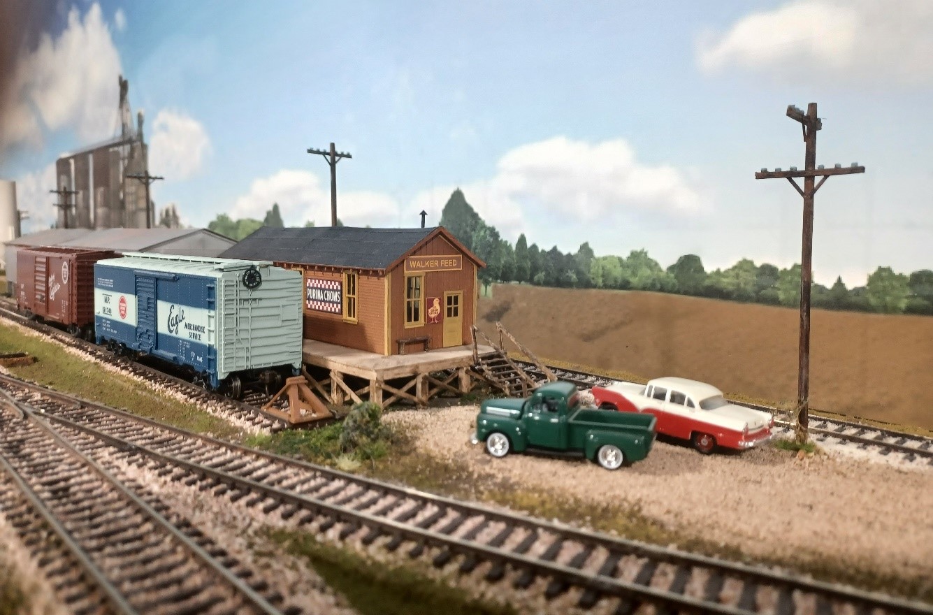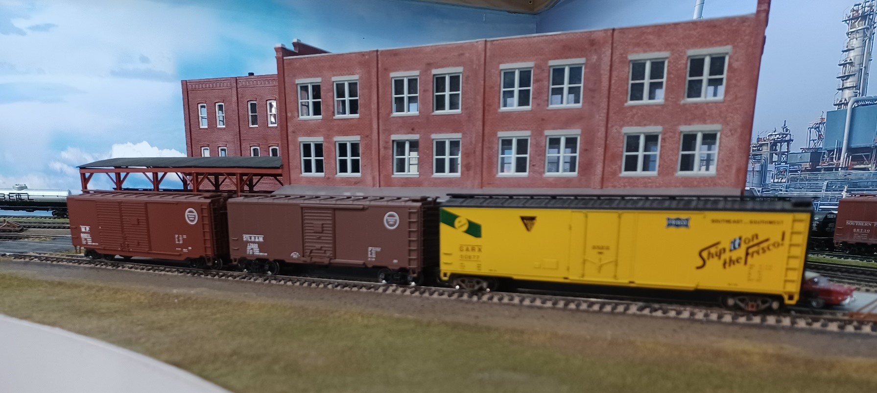 The layout is 5 years old is and fills about a 500 sq.ft. room. All the diesel locomotives are first generation with some steam making an appearance. Maximum speed on the branch is 25 M.P.H. Cars are set out and picked up by location using click track numbers. This line carried traffic from Kansas City, Conway Springs, Fort Smith, Little Rock and Osawatomie.