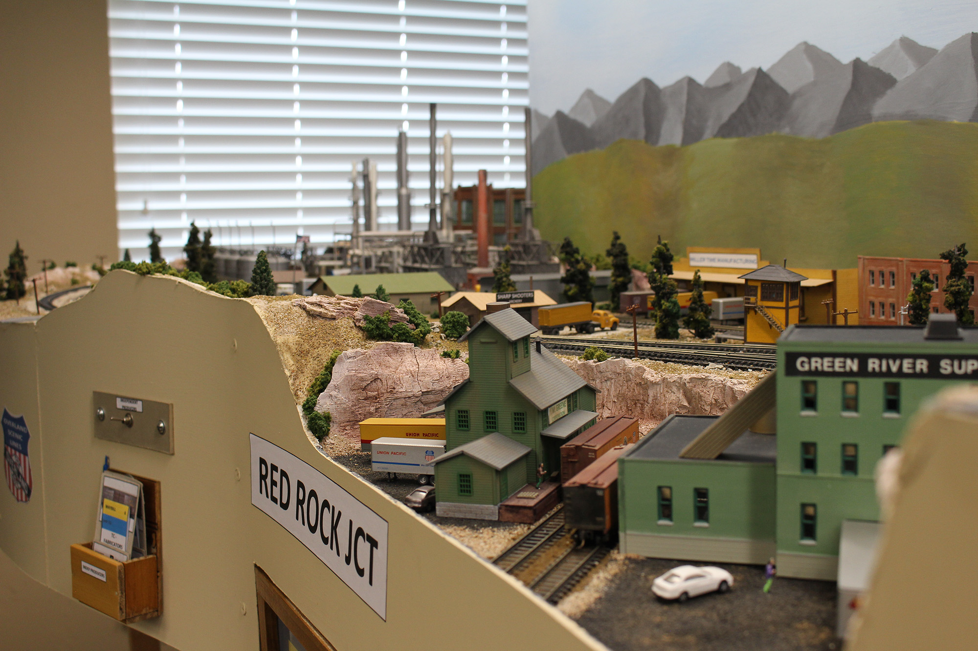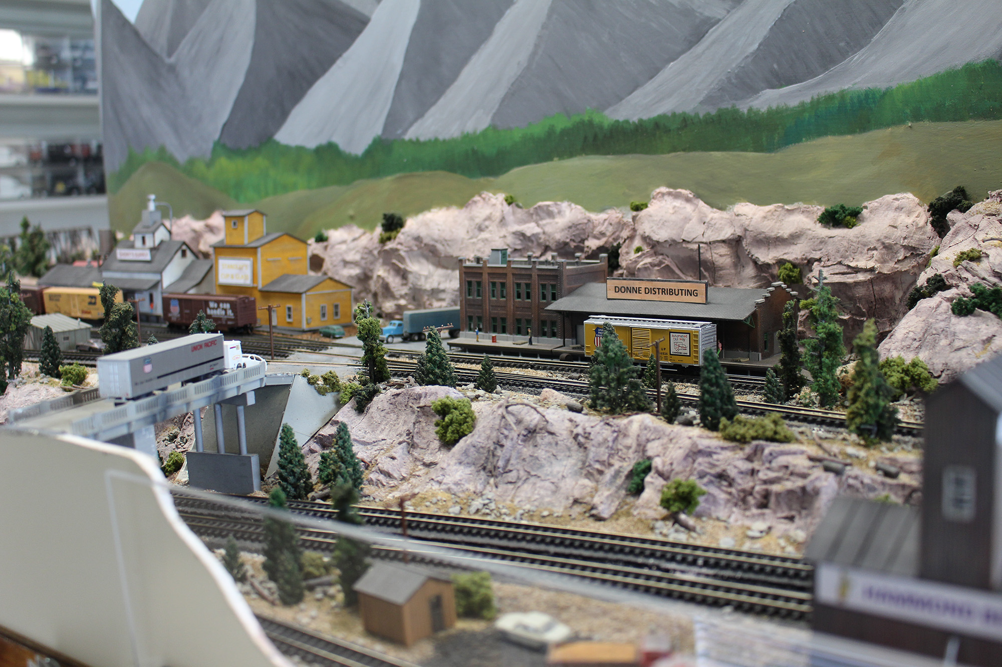 The layout has two separate lines (color coded for easy operations) that share passing sidings for easy crossover taking the 18’ by 24’ layout run about an hour to make the full circuit. Color coded car card system is used.