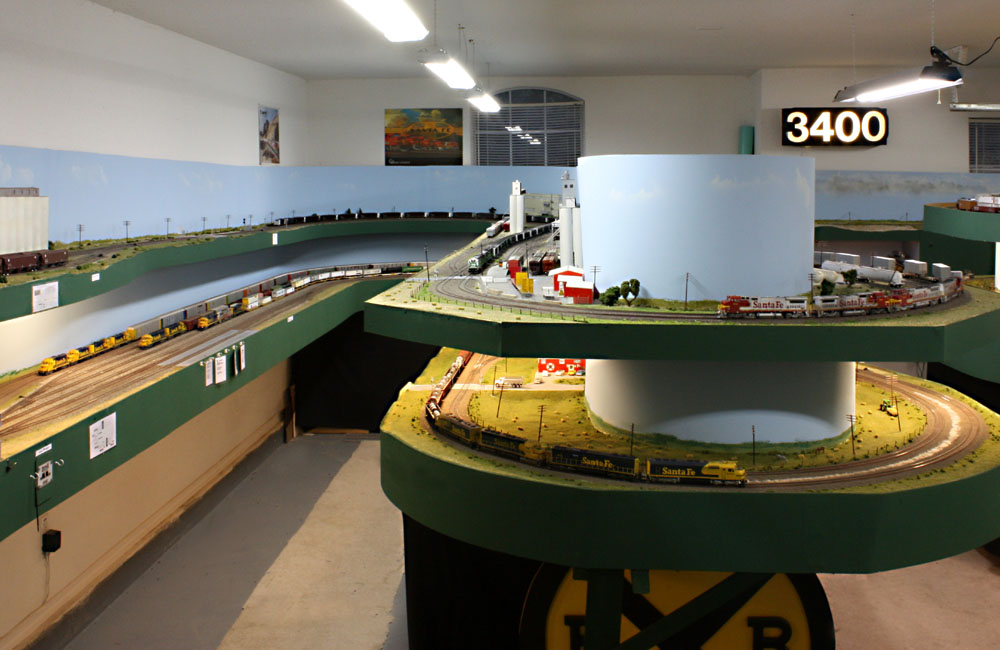 I model the Santa Fe's Hereford Subdivision from Amarillo, TX west to Clovis, NM during Sept of 1995. My layout is a double deck "nolix" design with an around the room helix with approx. 230' of mostly single-track main line that is governed by CTC signals that are controlled by a dispatcher in an adjoining room. Provided 2-way radios are used for communications between crews and the dispatcher. There are staging yards with return loops on each end of the layout so once a train reaches the end of its run, it's re-staged and ready to go again if needed during the session which typically last from 3 to 4 hours.